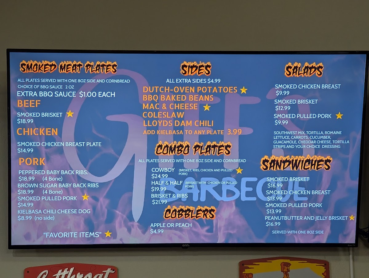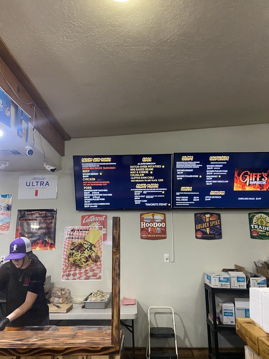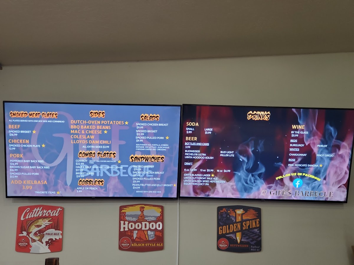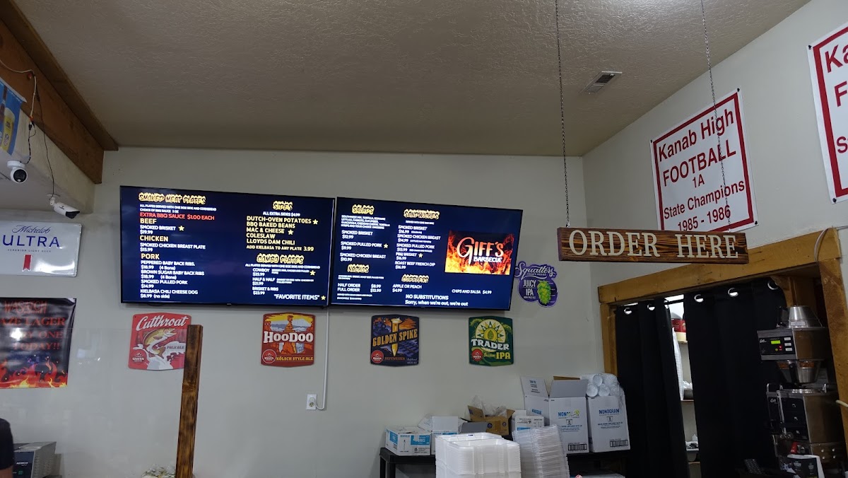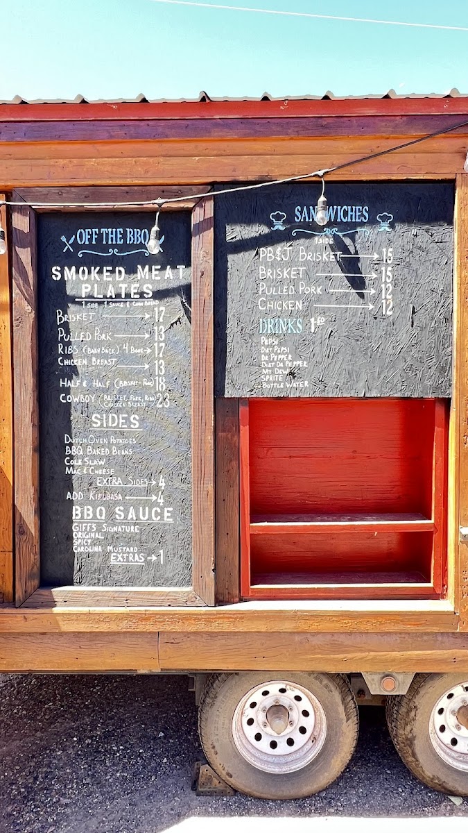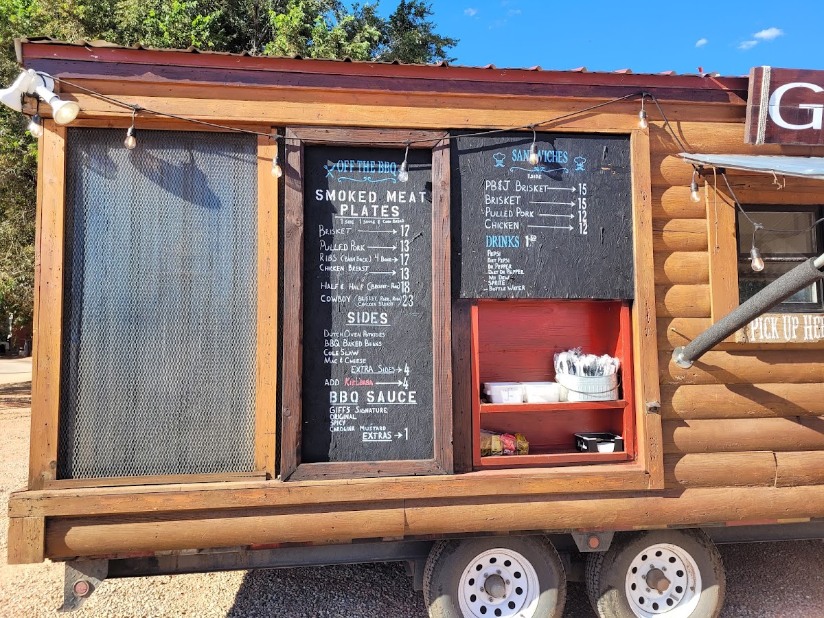 At Giff’s Barbecue in Kanab, Utah, the menu offers a delightful selection of smoked meats and comfort sides that cater to all tastes. If you're a fan of beef, the Smoked Brisket is a must-try, offering a smoky and tender experience that pairs perfectly with their Dutch-Oven Potatoes and BBQ Baked Beans. For those who prefer chicken, the Smoked Chicken Breast Plate delivers a juicy and flavorful option, complemented by your choice of sides like Mac & Cheese or Coleslaw.